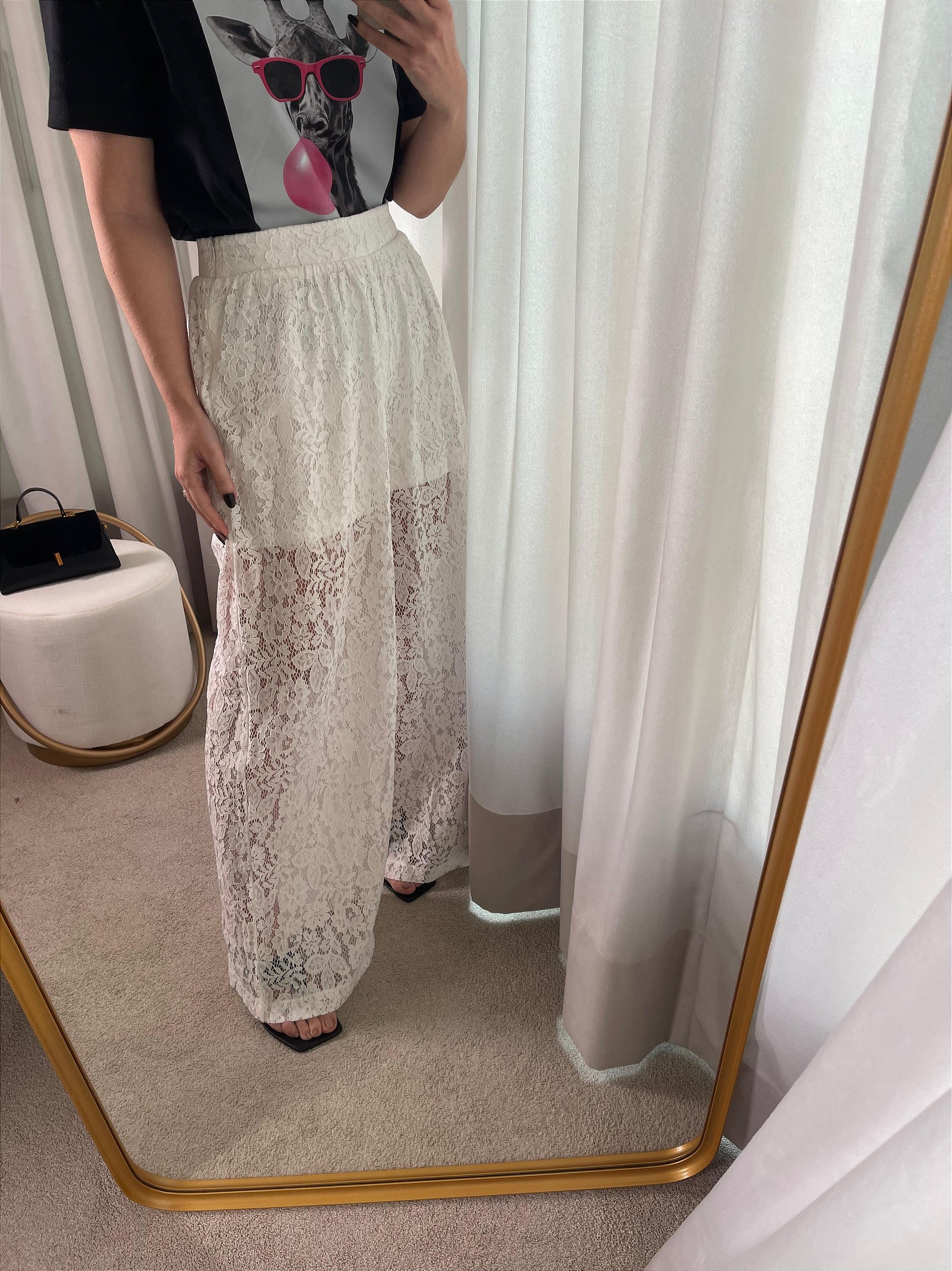 Delicada e cheia de personalidade, essa calça pantalona em renda off-white traz sofisticação e um toque romântico ao visual. Com forro curto e transparência sutil nas pernas, ela combina conforto e estilo de forma única. Ideal para composições leves e modernas, é perfeita para dias quentes e produções fashionistas. Cós alto e modelagem ampla garantem um caimento elegante.