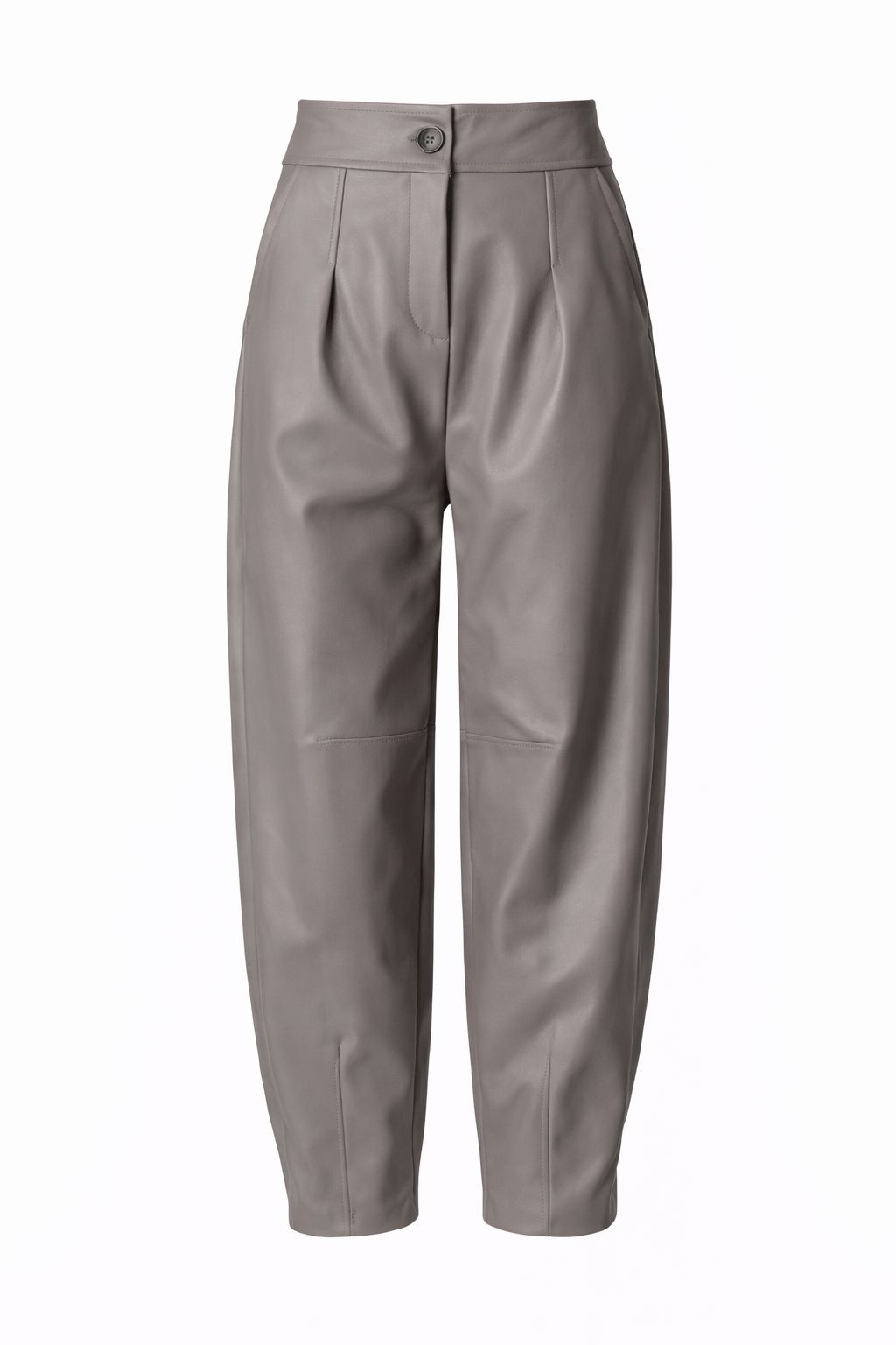 Calça modelo barrel em couro sintético, com pences na frente e nas costas que proporcionam melhor caimento. Conta com prega na cintura, bolso faca funcional na parte frontal e bolso alfaiatado decorativo. A modelagem com perna levemente ampla e barra estruturada garante um visual moderno e elegante.