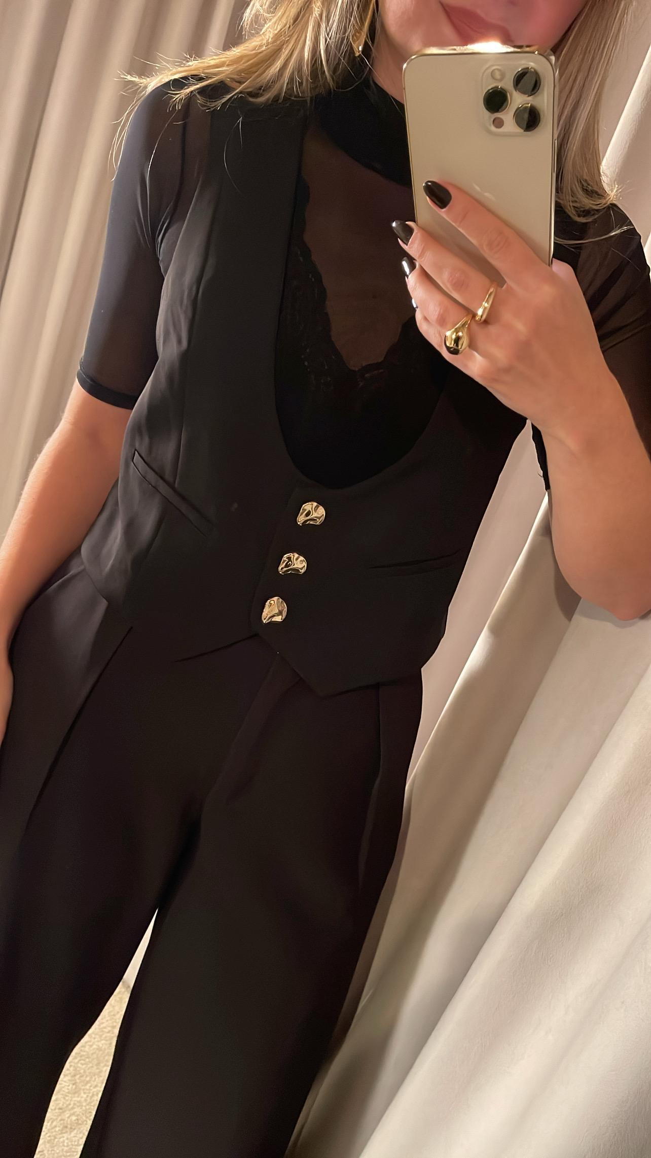 Colete com decote produndo, 3 botões dourados na frente, modelo mais sequinho, com detalhe de amarração com fivela nas costas. tecido alfaiataria.