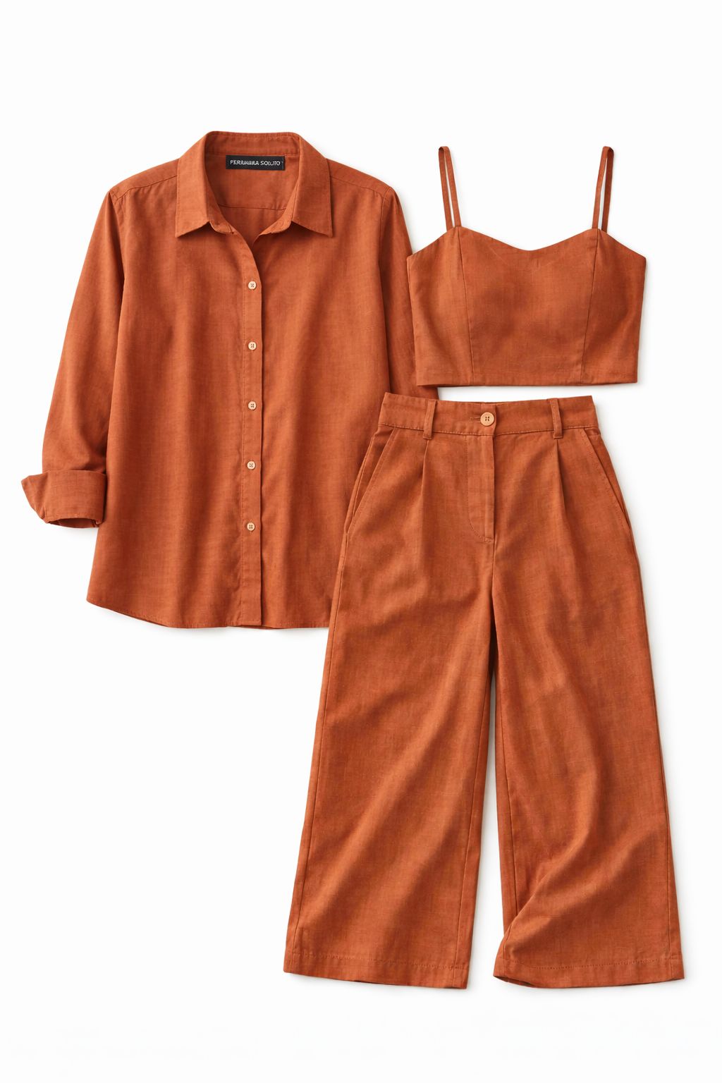 Elegante e acolhedor. No melhor estilo casual chic, o conjunto Julia composto por 3 peças, camisa, top e calça é versátil, lindo, prático e perfeito para sair, para trabalhar, para passear. Você pode usar as peças juntas ou totalmente separadas. O tom é acolhedor aos olhos. Feliz de quem tem um conjunto Julia.