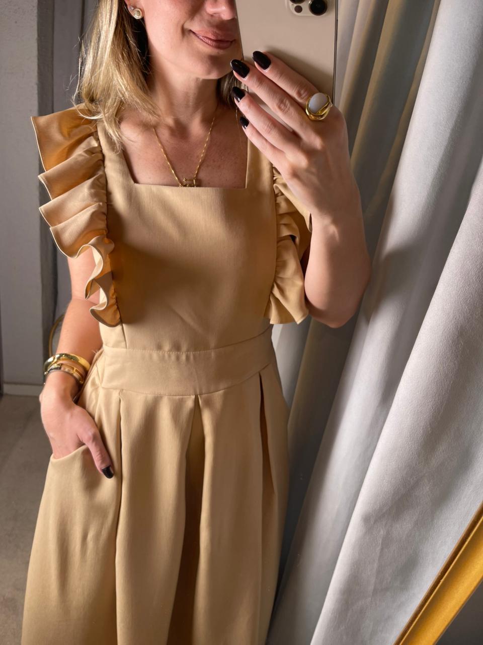 Vestido regata, com babados, recorte na cintura, pregas, bolsos nas laterais, elástico nas costas e tecido de alfaiataria. Cor: nude.
